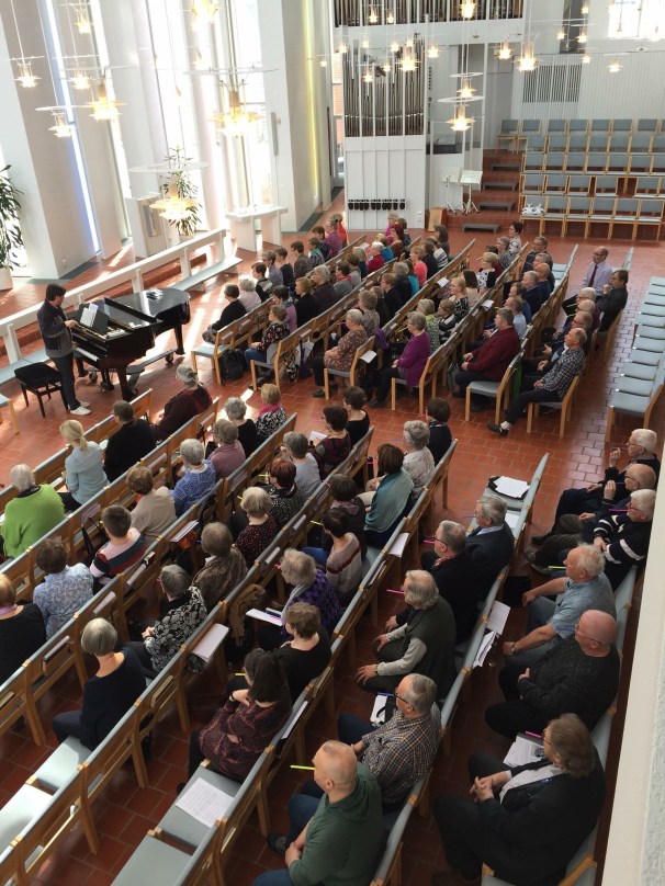 I worked with two groups: a chamber choir and a large group of church choir singers. The previous had a good spread of people of different ages, the latter consisted mostly of pensioners. I quite enjoyed both sessions. My main themes were pretty simple: energy, rounded, speech-like vowels, less activity in the head area and more space for the voice. And the old straw trick worked wonders.