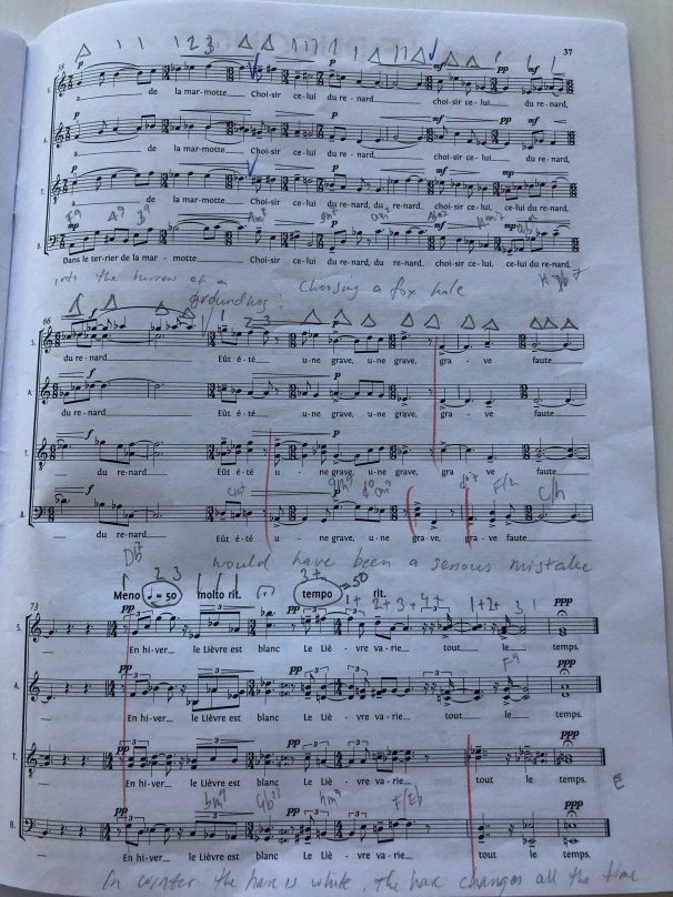 I have to say that the rehearsal had a calming effect on me. We made it through almost everything, albeit via some fairly iffy passages. But, on the whole, it was better than I expected. The singers are clearly either even better sight-readers than I imagined, or had put in some time navigating the difficult spots. Three contemporary works form the bulk of the program: four movements from Philippe Bodin’s Bizarre Bestiaire, Jan Sandström’s Biegga luothe and the premiere of a work by Paul John Rudoi. The latter two are pretty much bread and butter for this choir, not that they aren’t without their demands. As are the Renaissance madrigals I programmed as a sherbet between the main courses and the Ravel Trois Chansons that end the concert. But it is the Bodin that makes this concert demanding. Here is a page from one of the movements. Needless to say, the basic tempo is pretty snappy.